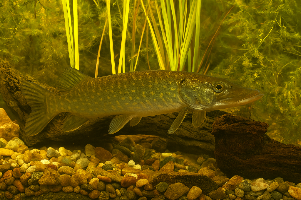 — oberständiges, großes Maul und reicht bis Augenmitte